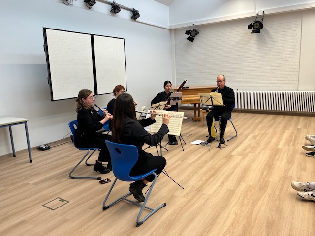 Am Donnerstag, den 29.01.2026 wurde die neue Aula der PDG zum Konzertsaal umgebaut, denn die PDG bekam Besuch von vier Musikerinnen und einem Musiker der Deutschen Radiophilharmonie. Das Bläserquintett, bestehend aus Querflöte, Oboe, Horn, Fagott und Klarinette, präsentierte allen Schülerinnen und Schülern der Klassenstufe 5 in zwei Veranstaltungen die „Bilder einer Ausstellung“ von Modest Mussorgsky. Das ursprünglich als Klavierzyklus komponierte Stück des russischen Komponisten aus dem Jahre 1874 thematisiert den Gang durch eine Ausstellung der Zeichnungen und Bühnenentwürfe seines verstorbenen Freundes Wiktor Hartmann und wird als ein Musterbeispiel für Programmmusik gesehen. Die Musiker des Rundfunkorchesters des SR und SWR nutzten eine Fassung für Holzblasensemble, die durch Klangfülle und Wucht begeistern konnte.  Dank der jeweils einleitenden Erklärungen zu den einzelnen Sequenzen des Werkes konnten die Schülerinnen und Schüler die musikalische Umsetzung der Gemälde gut nachvollziehen. Zudem gelang es den Musikern die Kinder aktiv einzubinden und regten sie z. B. an, komplizierte Takte mit einer Bodypercussion mitzuklatschen. Der gut einstündige Auftritt für jede Gruppe wurde durch die Vorstellung der einzelnen Instrumente und der unterschiedlichen Art der Klangerzeugung perfekt abgerundet. Schulleiter Richter und die anwesenden Lehrkräfte waren begeistert von der der perfekten Einbindung des Auftritts in den Musikunterricht der Klassenstufe 5, der die Unterrichtsthemen Instrumentenkunde und Programmmusik in beeindruckender Art veranschaulichte. Die Kinder waren ebenfalls begeistert und genossen das Konzert, die Mitmachaktionen und die Erklärungen der freundlichen und zugewandten Musiker gleichermaßen.