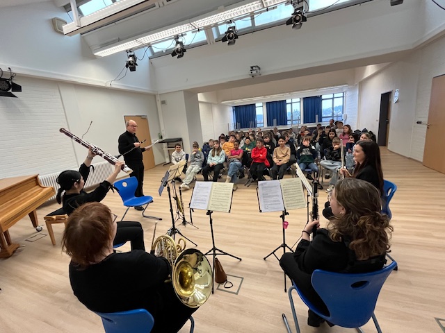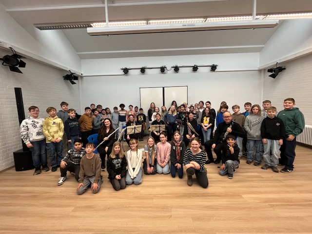 Am Donnerstag, den 29.01.2026 wurde die neue Aula der PDG zum Konzertsaal umgebaut, denn die PDG bekam Besuch von vier Musikerinnen und einem Musiker der Deutschen Radiophilharmonie. Das Bläserquintett, bestehend aus Querflöte, Oboe, Horn, Fagott und Klarinette, präsentierte allen Schülerinnen und Schülern der Klassenstufe 5 in zwei Veranstaltungen die „Bilder einer Ausstellung“ von Modest Mussorgsky. Das ursprünglich als Klavierzyklus komponierte Stück des russischen Komponisten aus dem Jahre 1874 thematisiert den Gang durch eine Ausstellung der Zeichnungen und Bühnenentwürfe seines verstorbenen Freundes Wiktor Hartmann und wird als ein Musterbeispiel für Programmmusik gesehen. Die Musiker des Rundfunkorchesters des SR und SWR nutzten eine Fassung für Holzblasensemble, die durch Klangfülle und Wucht begeistern konnte.  Dank der jeweils einleitenden Erklärungen zu den einzelnen Sequenzen des Werkes konnten die Schülerinnen und Schüler die musikalische Umsetzung der Gemälde gut nachvollziehen. Zudem gelang es den Musikern die Kinder aktiv einzubinden und regten sie z. B. an, komplizierte Takte mit einer Bodypercussion mitzuklatschen. Der gut einstündige Auftritt für jede Gruppe wurde durch die Vorstellung der einzelnen Instrumente und der unterschiedlichen Art der Klangerzeugung perfekt abgerundet. Schulleiter Richter und die anwesenden Lehrkräfte waren begeistert von der der perfekten Einbindung des Auftritts in den Musikunterricht der Klassenstufe 5, der die Unterrichtsthemen Instrumentenkunde und Programmmusik in beeindruckender Art veranschaulichte. Die Kinder waren ebenfalls begeistert und genossen das Konzert, die Mitmachaktionen und die Erklärungen der freundlichen und zugewandten Musiker gleichermaßen.