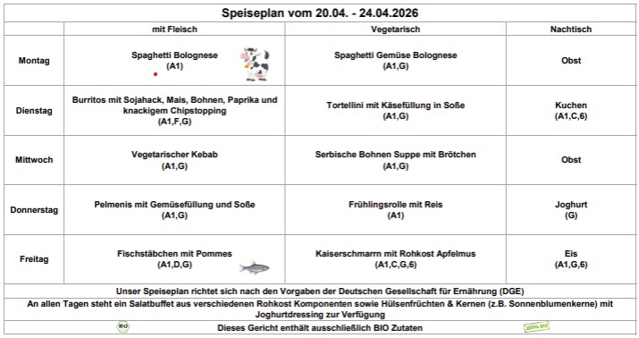 Bitte beachten: Seit dem 01.10.2022 kosten alle Gerichte 4,80 € inkl. 19% MwSt. Das Essen muss im Voraus gezahlt werden.