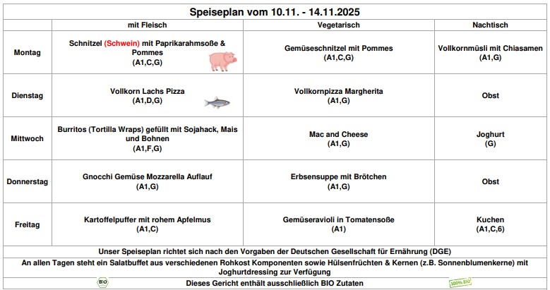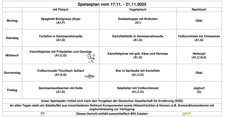 Bitte beachten: Seit dem 01.10.2022 kosten alle Gerichte 4,80 € inkl. 19% MwSt. Das Essen muss im Voraus gezahlt werden.