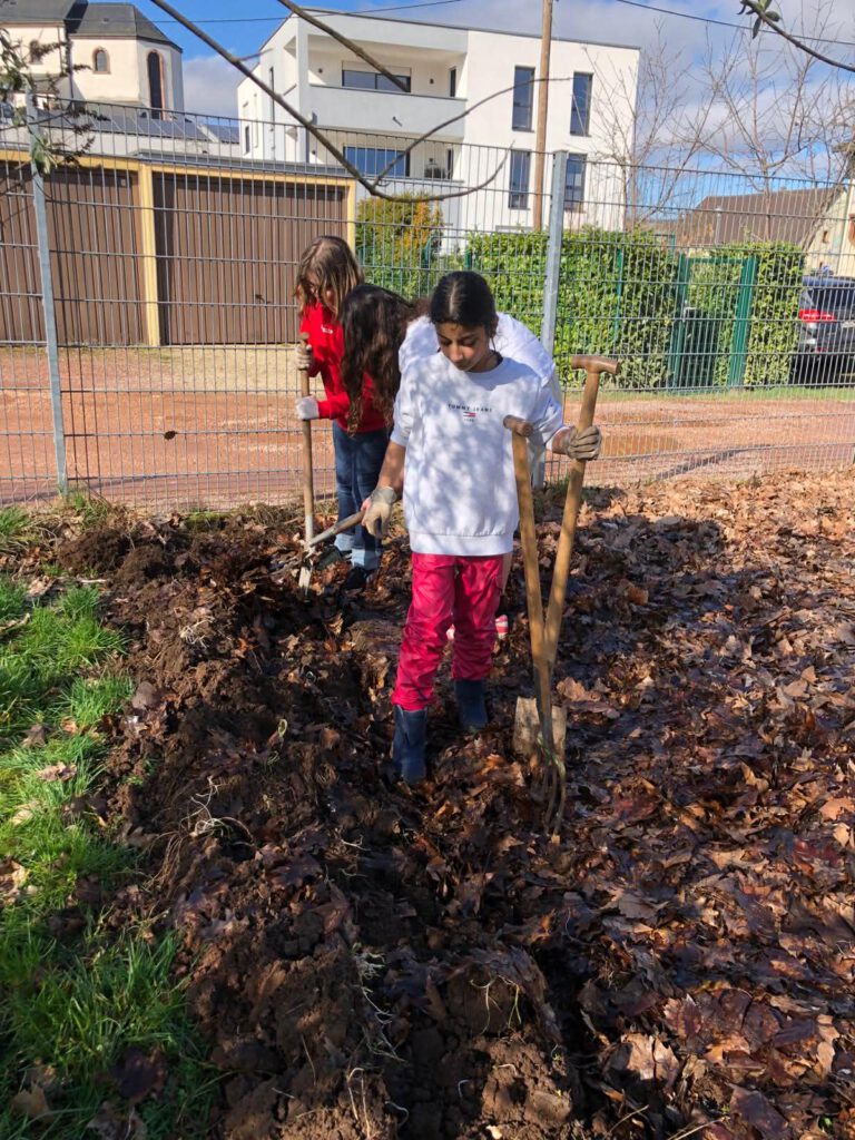 Die Mitglieder der Schulgarten-AG waren im März sehr fleißig, sodass die Ackerfläche am vergangenen Schnuppertag fertig umgegraben werden konnte. Dabei wurden auch Hühner eingesetzt, die uns beim Umgraben halfen, die Engerlinge effizient zu entfernen.